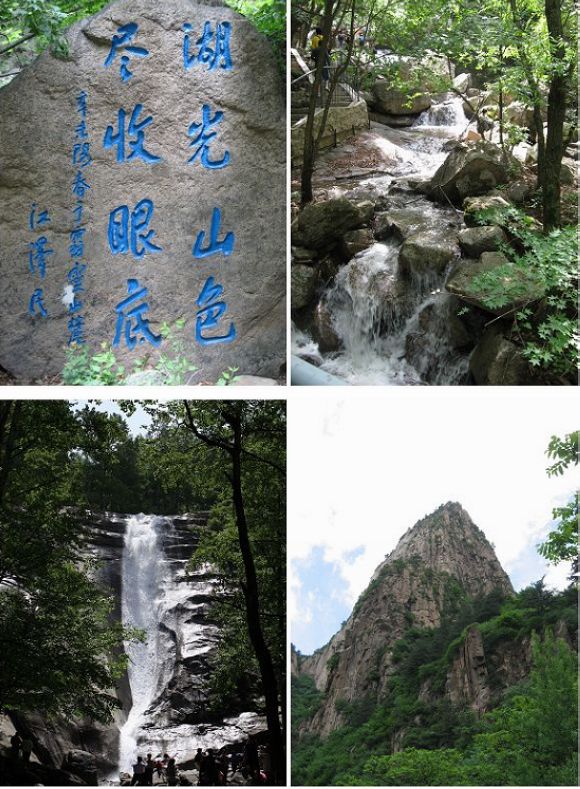 登山开始了,我们拾级而上,一路上多有楼台亭阁,山路蜿蜒,举目上望,有百级台阶,或时而窄陡,或时而伸延平展。石阶光滑平润,可以想见,此处游人如织的盛况。在一个硝壁前,当地人民为了纪念在抗日战争中献身的英烈而雕刻了壮烈的碑文,当我们只身来到碑前,不由肃然起敬,缅怀革命先辈的心情油然而生,爱国之情在此也得到了升华。