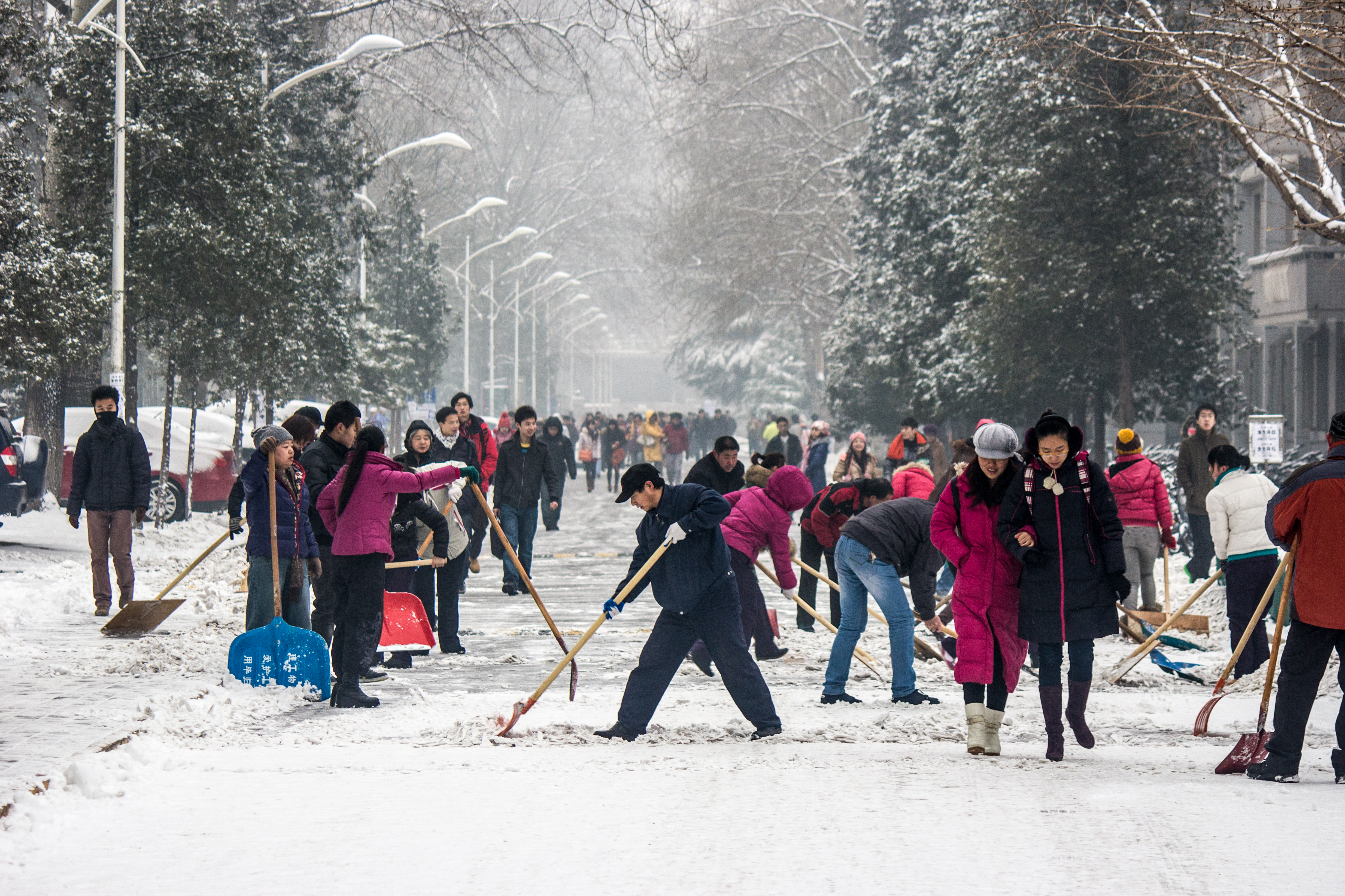 雪后的北理校园,一派热火朝天的景象。在舒适优良的环境之下,我们更应该记得那些在我们身后默默无闻毫无怨言的人。图为新一楼马路旁