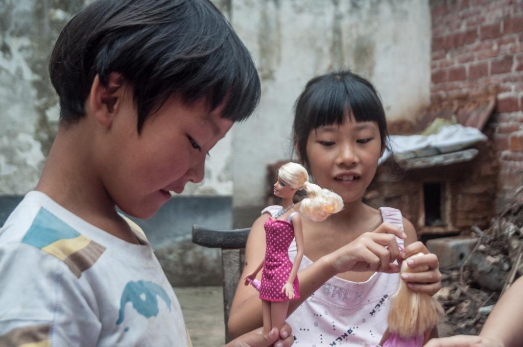 张晨曦(右)和妹妹晨露在玩芭比娃娃