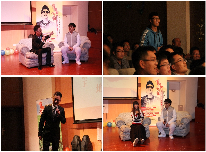 活动现场,杨光还请来了表演嘉宾。首先在“别轻易说做不到”板块请上场的是有“大陆机智王”之称的张地。张地分享了他出生贫穷家庭,但通过努力和对音乐的热爱,而登上大舞台的经历,他与同学们积极互动,现场改编歌曲巧妙回答同学们的问题,引来现场掌声不断。之后在“珍惜所有”环节,杨光请上了在汶川大地震中不幸双腿截肢,但依然乐观坚强唱歌的李应霞,她用她的故事和弹唱给现场带来了满满的“正能量”,同学倍受鼓舞。