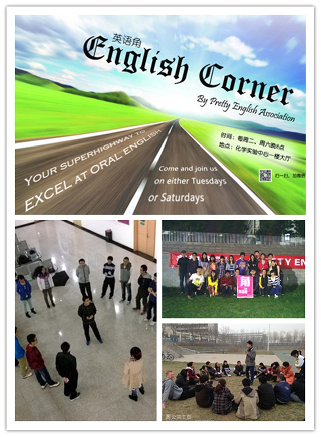 “English Corner”英语角活动为美韵英语协会的常规活动,每周举办一次。英语角为学生们提供了锻炼口语与思维能力的平台,还能启发了同学们对当前时代热点的思考。例如,2013年12月7日的英语角话题为“雾霾产生的原因以及改进天气的措施”,参与的同学们讨论热烈,纷纷提出了自己的观点。随着讨论的逐渐深入,话题也被推向工业化和城市化方面——工业化城市化对环境的影响以及是否需要减速工业化和城市化来减轻污染。大家纷纷提出对环境改善方面的建议与看法,相互补充。
