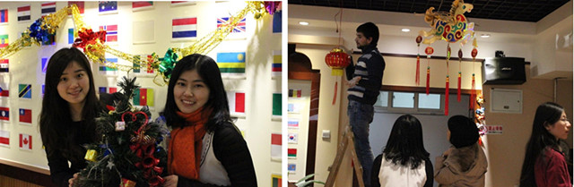 1月10日一大早,学生们就来到了留学生中心活动室,和老师们一起挂灯笼、贴窗花、贴对联……按照中国的新年习俗把活动室布置一新。此次迎新年活动主要包括剪窗花、猜灯谜、中国书法和包饺子四个项目,来自巴基斯坦、卢旺达、德国、美国等几十个国家的外国留学生,热情洋溢地参与到各项活动中,大家都沉浸在一片热闹、喜庆的节日气氛中。