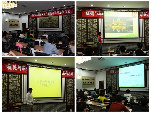 为了更好地指引、辅导毕业生摆正心态,掌握就业技巧,找到满意的职位;并针对高年级的本科生做好职业规划指导,针对有留学意向的同学做好出国前准备工作的指引,本学期机械与车辆学院围绕“职业生涯规划指导”、“走出去、大未来——留学申请指导”、“求职技能大提升——简历面试工作坊”三个主题开展,开展了一系列精彩纷呈的“笑迎职场”就业指导活动。