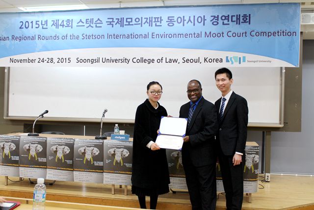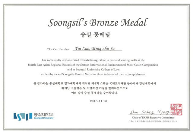 2015年11月24-28日,第20届国际环境法模拟法庭大赛(International Environmental Moot Court Competition,IEMCC)东亚地区选拔赛(East Asia Regional Round)在韩国崇实大学(Soongsil University)举行。米兰milan官方网站法学院派出的代表队一路过关斩将,位列前三,喜获铜牌。