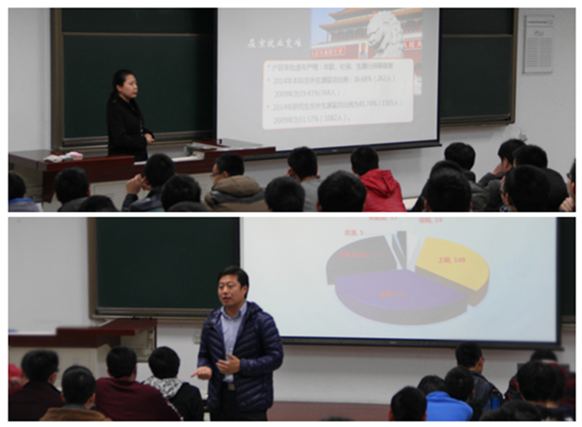 分论坛一“职业选择与规划”主题论坛二年级专场,于21日晚在良乡校区1-103室举行,2014级350余名同学参加了本场论坛。根据同学们前期反馈的困惑和问题,与同学们围绕“选择”与“规划”展开讨论。张雨甜老师首先讲解了职业生涯规划和职业兴趣的基本理论,通过理论的自我认知和测评手段,结合我院毕业去向和数据分享,面向大二抉择期的同学们进行不同的出路规划分析。以国防企业、汽车制造企业等为例,分析了本科就业、硕士就业的岗位特点、成长空间、发展方向的异同和比较,给予同学们密切关注的“考研和就业如何选择”的建议。