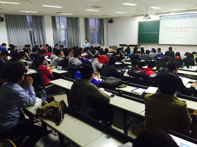 2016年3月30日晚6:30,机械与车辆学院本科生一二年级学生干部培训会在良乡校区理科教学楼203举办。学院党委副书记副院长范文辉、团委书记郝佳馨、研工委书记韩阳、生涯发展指导服务中心主任张雨甜、团委副书记李超、辅导员程继超、马凯以及学院2014级、2015级本科生班团学生干部、各社团组织学生骨干等近两百人参加了培训会。