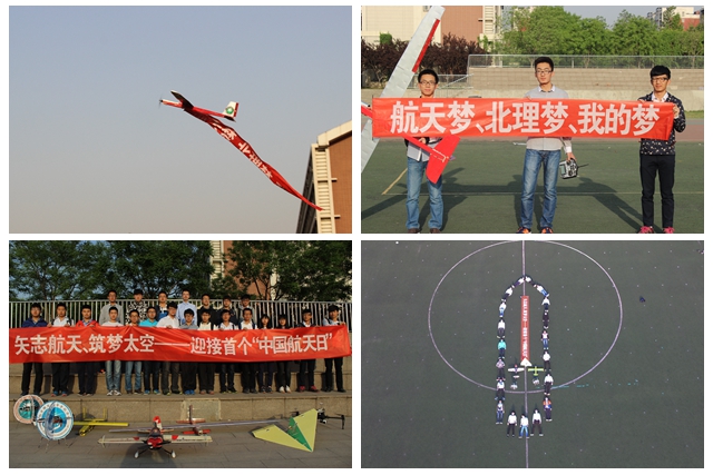 学校着力加强航天科技高端人才队伍建设,涌现出一批又一批的航空航天人才。同时,还有这样一支学生队伍,他们怀揣真挚梦想,不断的披荆斩棘、追逐梦想。2001年组建起的北理航模队,正是学校在人才培养工作中强化“拓天”意识、加强航天科技人才培养的生动体现。今天,队员们用自己独有的方式,在良乡校区为同学们演绎了一场特殊的航模飞行表演。迅速升空的滑翔机牵引着 “中国梦、北理梦、我的梦”的条幅;以模拟嫦娥登月项目为目标的返回式模型火箭成功发射,返回舱成功着陆并打开,探测车成功出仓到达制定地点;以校徽和院徽为形状的飞行器与纸飞机一同升空,表演了飞机对冲、拉筋斗等特技飞行动作;以航拍的方式记录下一张特别的航天特色照片。这每一个让人欢呼的瞬间,既是航模队成员追逐梦想的见证,也是理工学子勤奋务实的最佳写照。