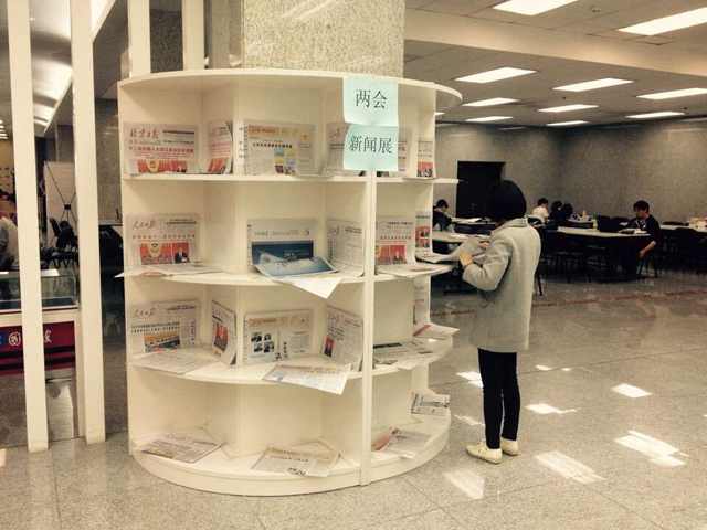 2016年是“十三五”规划的开局之年,随着2016年全国两会的顺利召开,为更好地学习贯彻两会精神,图书馆以“世界读书日”为契机,利用馆内丰富的报刊资源在图书馆一层休闲区,向读者展示有关“两会”专题的新闻报道,以使读者更加便捷、集中地了解两会热点、学习两会精神,在提高学术造诣的同时,加强精神建设,关心时事,完善自身修养。