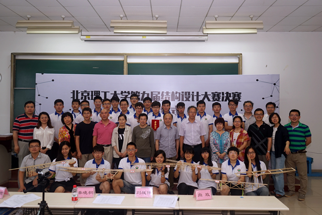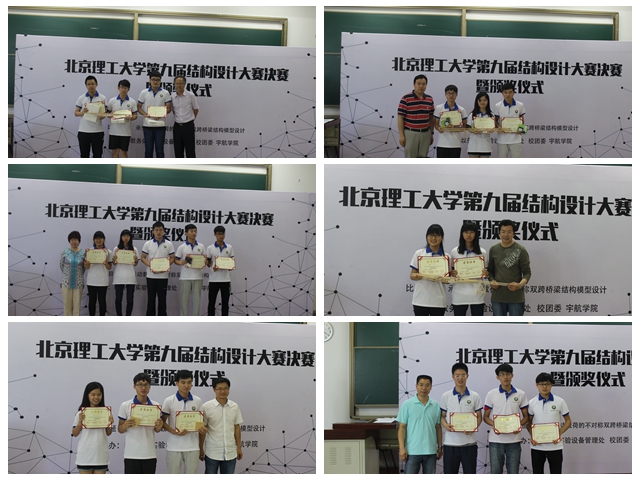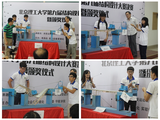 2016年6月7日,由教务处、实验室与设备管理处、校团委、宇航学院联合主办的米兰milan官方网站第九届结构设计大赛决赛在良乡校区理科教学楼102教室举行。本次竞赛历时一个多月,共有来自宇航学院、机电学院、机械学院等10个专业学院的共211组、633名同学报名参赛。一共100组选手通过了审议并获得了参加5月29日的预赛资格,其中20组通过预赛选拔进入决赛。实验室与设备管理处副处长彭绍春、校团委副书记尚松田、宇航学院副书记副院长方蕾、教务处曲芳堃老师等在决赛现场观看了比赛并为获奖选手颁奖。