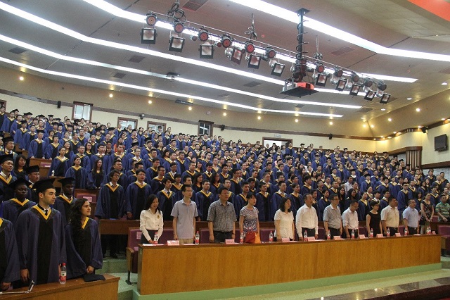 在庄严的国歌声中,毕业典礼拉开序幕。