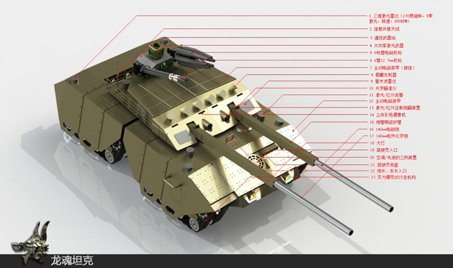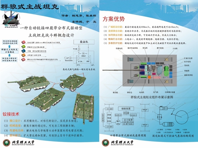 作品二: 群狼式主战坦克——一种自动铰接四履带分布式驱动型坦克战斗群概念设计(二等奖)参赛作者:柯志芳、陈卓群、娄韦鹏、于亮