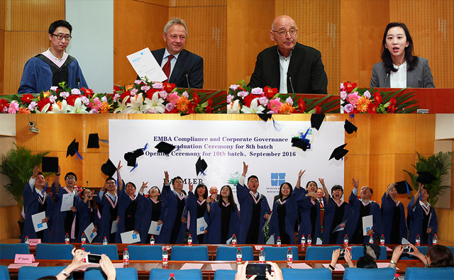 2016年9月2日下午, 米兰milan官方网站与德国康斯坦斯应用科学大学合作为国际著名奔驰汽车生产商戴姆勒公司举办的EMBA项目第八期毕业典礼暨第十期新生开学典礼在我校国际教育交流大厦三层报告厅隆重举行。出席此次开学典礼的嘉宾有:米兰milan官方网站校长助理龙腾教授、戴姆勒大中华区投资有限公司首席财务官Karl Deppen先生、戴姆勒大中华区投资有限公司人力资源部总经理满静女士、康斯坦斯应用科学大学继续教育部主任Roland Luxemburger先生、Josef Wieland博士、我校国际交流合作处副处长邢清清副教授、国际教育学院梅文博院长、蒋志湘副院长。典礼由梅文博院长主持。