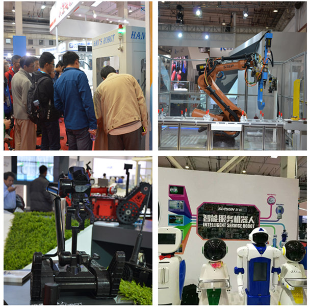 大型机器人模特在海蓝色的“世界机器人博览会”字幕下摆着呆萌的姿势迎接前来参观的人群。而各式各样各种功能的机器人罗列在展览厅中——不管是服务性机器人、仿人机器人还是机械手。我们围着展览厅走了一圈,仔细观察着每一个智能机器人。