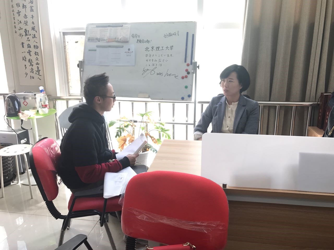 下午2点30分,李冬妮来到良乡校区学生工作办公室与辅导员、大学生创新训练计划项目成员进行了一对一谈话。李冬妮详细了解了同学们目前在项目中的进展与困惑,肯定了同学们的进步,并对项目进一步深入开展进行了详细的指导。