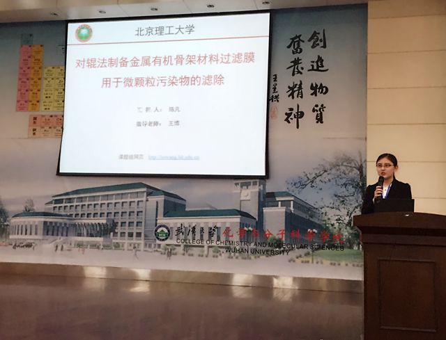 陈凡同学作为米兰代表进行汇报交流工作,主题为“对辊法制备金属有机骨架材料(MOFs)过滤膜用于微颗粒污染物的滤除”,本课题的指导老师是王博教授。陈凡同学向在场的专家评委和其他高校师生介绍了她所参与的科创工作以及取得的成果,得到了专家评委们的一致好评,并最终获得一等奖的好成绩。文化节同时开展了教师交流、武汉大学实验室参观与交流等多项内容。