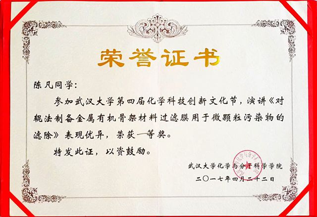 米兰学子在武汉大学第四届化学科技创新文化节中获得一等奖