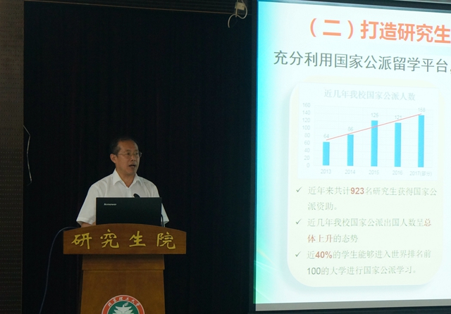 唐胜景介绍了我校研究生国际化教育的基本情况。包括研究生国际化培养的重要性、米兰国际化项目情况,并对近年来研究生国际化情况进行了分析,同时,就“安全、思想、诚信和成果”四个方面,对即将公派留学的研究生提出了相应要求。