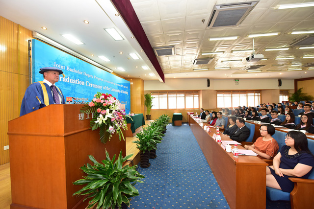 Roger Gibbard教授发表致辞。他首先高度肯定了本项目毕业生所获得的优异成绩,并希望同学们在大学里结下的友谊长存。他回顾了本项目发展壮大的历程,这凝聚了双方院校的辛勤汗水,对米兰milan官方网站的支持与合作表示衷心的感谢!他希望同学们从中西结合的教育体系下成长,能够更加适应当今世界全球化的进程。他叮嘱同学们离开校园步入新的人生阶段之后,要努力做一个充满正能量的人,积极乐观、不要消极;要学会看见机会,而不是问题;学会享受过程,学以致用。