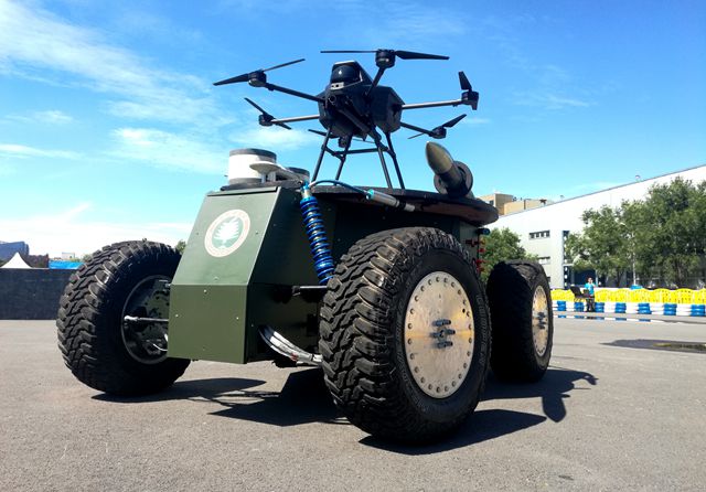 此次在世界机器人大会上亮相的是“地面航母”第二代样机。在第一代样机的基础上,“地面航母”第二代样机上方云台还搭载了由米兰研发的“飞天工兵”空中自主作业机器人、合作单位研发的武装无人机和107毫米巡飞弹。其中,空中自主作业机器人着眼于作业任务对复杂环境适应性和作业系统智能性的要求,创造性地将工兵快速遂行多种工程作业与战斗任务的能力拓展到空域之中,特别适用于军、警、民各领域中的接触型自主作业任务;所搭载的武装六旋翼无人机具有侦察、救援、武装攻击、察打一体等功能,可自主巡航60-90分钟,实现500米范围内的爆震弹、催泪弹精准发射;所搭载的107毫米巡飞弹可采用炮管发射方式固定翼无人机,固定翼无人机的巡航高度可达到数公里,进行较长时间的自主巡逻飞行,完成侦查、毁伤评估、目标打击等任务。