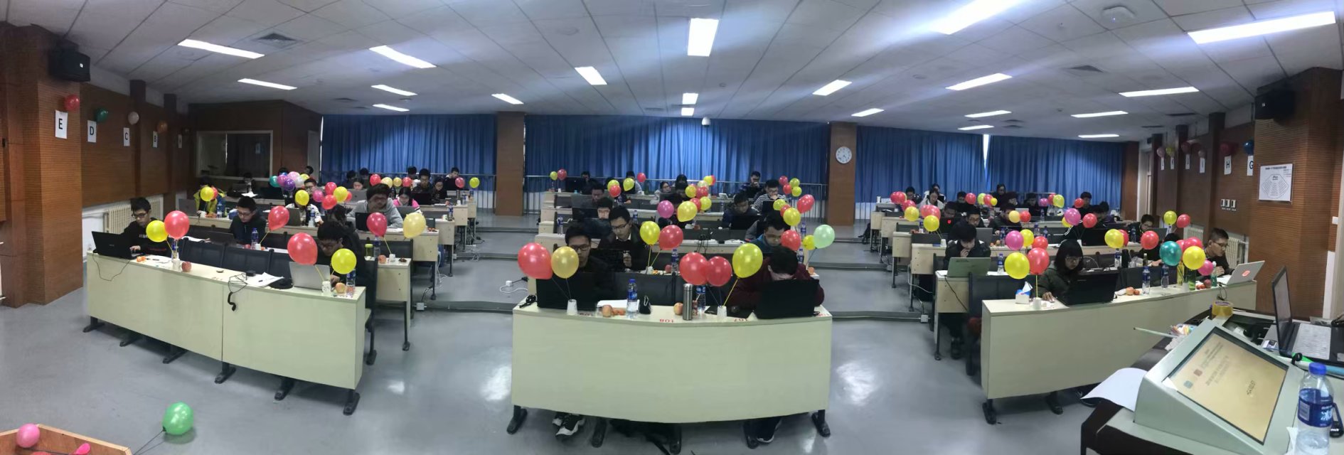1月28日下午,基地算法艺术学生创新实验室为参训的2017级学生举办了算法培训总结比赛,仿照ACM程序设计竞赛赛制,要求全体学生在5个小时内完成12道赛题,以此来检验同学们集训期间参加算法培训的学习成效。本次集训算法培训部分共持续9天,培训内容包括数据结构、贪心思想、动态规划、并查集、线段树等7个算法专题,并布置了69道编程练习题。比赛场上,有的选手胸有成竹、奋力编码,有的选手静坐沉思、找寻解题方法,有的选手在草稿纸上写写画画、整理思路。担任比赛志愿者的2016级学长学姐实时根据比赛过题情况给选手发放气球,共同探讨赛题的解题要点并根据同学们代码提交情况有针对性的整理题解。这场紧张刺激的算法比赛和学长学姐们的辛勤付出给集训同学们留下深刻的印象,成为本次集训期间的珍贵回忆。
