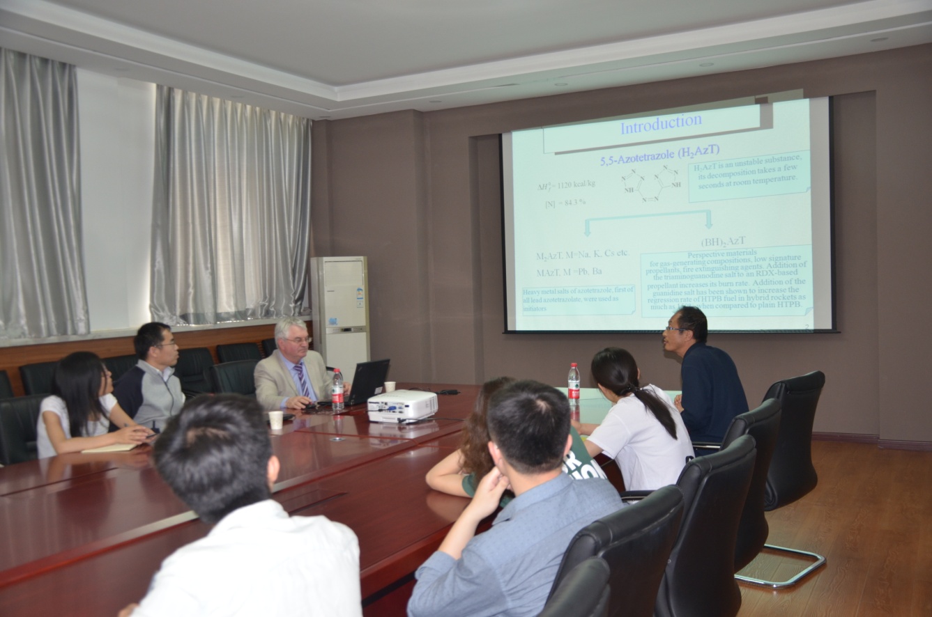 访问期间,实验室先后组织了5场精彩的学术报告,Marc A Meyers教授在报告中阐述了高能短脉冲激光辐照在固体材料表面,可以在极短时间内(纳秒)产生几十到上百GPa压强的冲击波并沿着传播方向迅速衰减,利用这种技术可以产生其他实验手段所达不到的极高应变率。V.P.Sinditskii教授就含能化合物的热化学、热分解和燃烧爆炸行为问题,提出了热分析技术和测压技术相结合的分析测试手段,对比并解释了造成这些化合物性能差异的原因。Ahmed MEBARKI教授在报告中以火灾爆炸、海啸等灾害为例,讲述了灾害发生后的传播以及多米诺效应。这些报告集中反映了材料在极端载荷下的动态力学行为、高能钝感炸药的设计理论等方面的国际前沿研究课题,报告受到了师生的热烈欢迎,引发了现场师生的极大兴趣,并与专家学者展开了热烈的讨论。