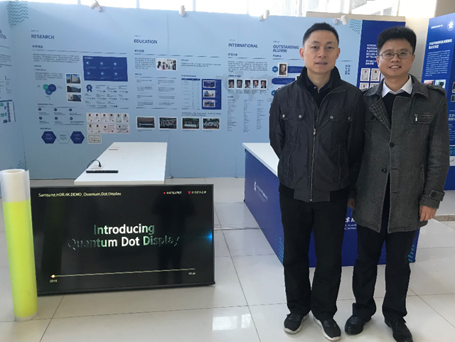 讲座结束后,由钟海政教授陪同,段炼教授参观了材料学院纳米光子学实验室,了解了该实验室在量子点显示技术方面的研究进展,特别重点关注了该实验室钙钛矿量子点光学膜技术的产业化进程,并给出了建设性意见。