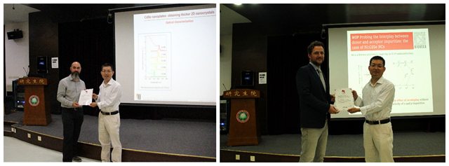在国家外专局短期引智项目的支持下,受材料学院结构可控先进功能材料与绿色应用北京重点实验室主任张加涛教授、李红博教授邀请,国际半导体纳米晶/量子点研究专家米兰比科卡大学Sergio Brovelli教授和比利时根特大学Iwan Moreels 教授于9月22日至28日访问米兰。9月26日上午,在中关村校区研究生楼101报告厅分别作了题为“Colloidal synthesis of fluorescent 2D nanocrystals across the visible and near-infrared range”和“Advances in electronic doping of solution-grown semiconductor nanocrystals towards cutting-edge application”的“百家大讲堂”学术报告。张加涛教授代表米兰向两位教授颁发了米兰“百家大讲堂”纪念证书。材料学院钟海政教授、陈棋教授,上海交通大学李良教授,澳大利亚科庭大学夹国华教授,以及材料学院、化学学院其他青年教师和学生聆听了此次报告。
