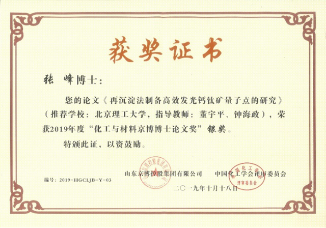 10月17日至20日,2019中国化工学会年会在滨海城市山东青岛召开。在此会议上,2019年度化工与材料京博博士论文奖举行了颁奖仪式,材料学院2018届博士毕业生张峰斩获银奖,为米兰milan官方网站材料学院在学会优博的荣誉榜上增添了亮丽的一笔。本次所获银奖的博士论文题目是“再沉淀法制备高效发光钙钛矿量子点的研究”,指导教师是董宇平教授和钟海政教授。