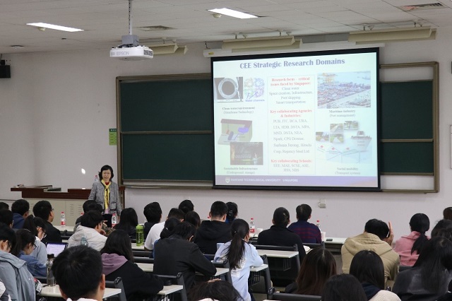 王蓉教授首先向大家介绍了新加坡和南洋理工大学的基本情况,以及新加坡目前面临的水资源短缺这一严重问题,引出本次报告的主题。此后,王蓉教授对目前所从事的水通道蛋白膜与生物工程膜、正渗透膜、以及高性能中空纤维纳滤膜三项核心工作做了详细且深入介绍。最后,作为即将继任的国际知名膜期刊《Journal of Membrane Science》共同主编,王蓉教授向同学们介绍了本期刊的相关发展历程与投稿经验,重点就学术论文的写作尤其是学术道德规范向大家做了细致讲解,大家受益良多。