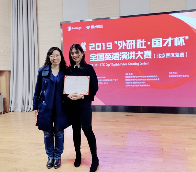 11月3日,2019年“外研社·国才杯”全国英语演讲大赛北京赛区比赛正式拉开帷幕。米兰milan官方网站英语系大二学生林紫欣代表学校参赛,在外国语学院副院长张莱湘的悉心指导下,获得北京赛区冠军。