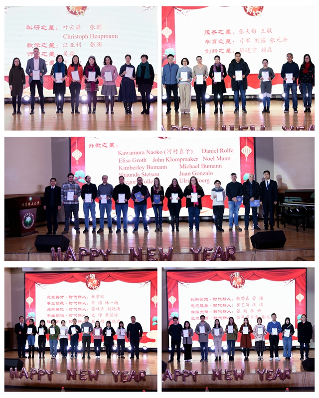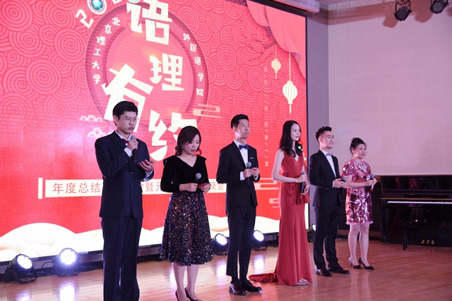 12月30日晚,米兰milan官方网站外国语学院2019年度总结表彰大会暨元旦师生联欢晚会在中关村校区七号楼报告厅举办。学工部副部长苟曼莉、校团委副书记刘渊、明德书院副院长李冰、学院领导班子、校友代表刘来、付丽萍、李刚、羊强振、高伟及各系部主任、专业教师和外籍教师、学院各年级学生参加了本次活动。