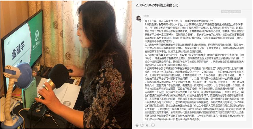 “突如其来的疫情把我们即刻‘逼’上了网络授课的平台,作为一名老教师,在这个特殊时期必须要有担当、不辱使命。”马秋君分享了自己的“主播”初体验,“20年前我开始使用QQ,是最早使用QQ的一批人,9年前微信诞生时我又是第一批追随者,因为那时觉得自己还够年轻。但今天的慕课、雨课堂似乎离我太遥远了,感觉那是年轻人的世界。兰亭集序里的大士们叹老之将至,那何尝不是我呢。现在我要像小学生一样学习如何使用乐学平台,添置了带混音麦克的‘主播’装备,我以各种方式记住那些流程,我需要请教年轻老师,需要在乐学平台读懂我00后学生的语言,梳理他们的反馈。非常时期,做一个不落伍的老教师,真不容易啊!”