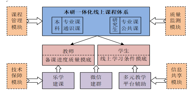 根据学校总体部署和要求,人文学院高度重视,第一时间动员本科生、研究生课程相关任课教师。人文学院构建“一体、两线、三平台、四模块”全方位课程保障体系,统筹本、研线上教学一个标准、一个体系,分别通过乐学建课、微信建群答疑、多元混合教学三个平台推进,筹备阶段进行了“教师备课进展质量摸底、学生线上学习条件摸底”的双摸底工作,保障线上授课顺利进行。人文学院构建了四大保障模块,“课程管理模块”通过建立线上教学工作领导小组、本科、研究生线上课程教师群和学院教学管理工作群,第一时间做好了统筹管理与协调工作;“技术保障模块”通过线上答疑、技术问题汇总、相关教程分享等解决学院教师线上授课技术困难;“质量监测模块”建立了乐学平台督导组、线上授课直播预演试讲群等,全方位保障线上课程授课质量;同时,“信息共享模块”通过云端经验共享、“建课进展”日更新等方式促进异空间的沟通交流。