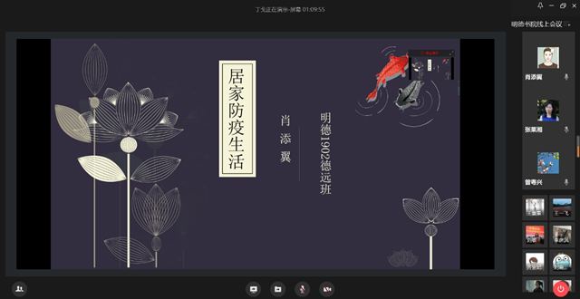 同学们依次分享了在疫情期间的居家生活、学习情况和成长收获,并对网络教学环节、学生活动等方面提出意见和建议。同学们以高度的学习热情投入到线上学习的同时,也养成了一些良好的习惯,如日常锻炼、培养良好生活技能等。黄思旅表示,当学习热情有所下降时,她会采取和同学一起结伴学习、互相督促的方式,取得了良好效果。朱宇玮谈到,在学习生活之余,她积极从事了志愿服务工作。