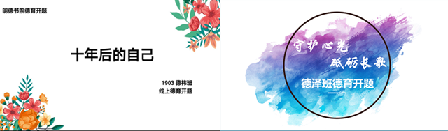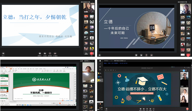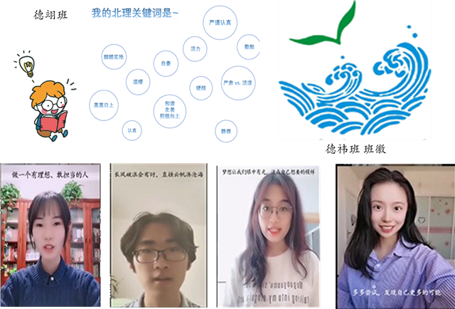 “受到北理一丝不苟、踏实认真、低调从容品质潜移默化的影响,我在追求卓越的路上不断前行”德翊书生丁戈在德翊班特色环节“我·北理初印象”中抒发了对我校的真情实感。德祎班“班徽设计”特色活动,以“一”与班名“祎”谐音寄托了全体德祎人的美好希冀;德清班诗朗诵《万众一心抗疫情》,慷慨激昂,掷地有声,尽显当代大学生对抗疫工作者的崇敬,以及对“战疫”必胜的决心。每个班级通过自己的特色活动展示了这段特殊时期班级的新时期书生风貌、充实的学习生活、相互诉说着思念。虽然无法面对面,依旧可以心连心。