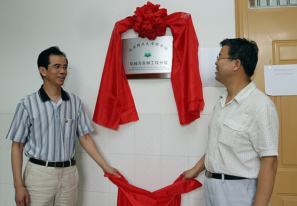 2007年7月23日下午,“米兰milan官方网站图书馆机械与车辆工程分馆”挂牌仪式在机械与车辆工程学院举行。校党委副书记赵平(右)、副校长孙逢春(左)参加了挂牌仪式并共同为“米兰milan官方网站图书馆机械与车辆工程分馆”揭牌。参加挂牌仪式的还有机械与车辆工程学院院长项昌乐、常务副书记张英、副书记兼副院长郝洪涛、副院长胡纪滨、副院长左建华,图书馆馆长张永发、副馆长马宏伟、办公室主任张静,仪式由副馆长马宏伟主持。