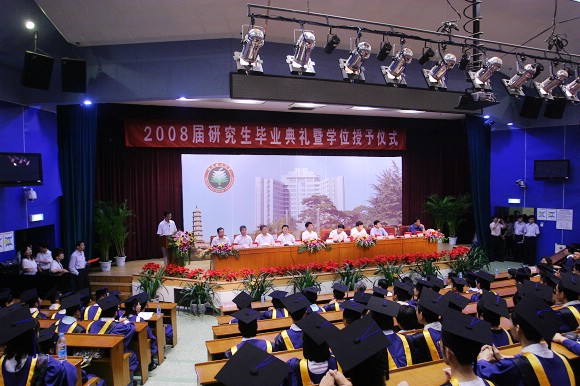 7月1日上午,我校隆重举行了2008届研究生毕业典礼。校党委书记郭大成,校长、研究生院院长胡海岩,校党委副书记、副校长杨宾、校党委副书记、工会主席侯光明,副书记赵平、纪委书记杨蜀康、副校长赵长禄、副校长孙逢春,副校长杨树兴,副校长赵显利出席了典礼。