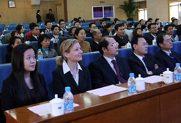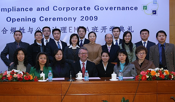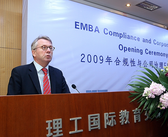 “合规性与公司治理”高级工商管理硕士(EMBA)班是我校与德国康斯坦斯应用科学大学和因戈尔施塔特应用科学大学合作举办的。该项目以“合规性与公司治理”为主题,旨在培养具有最高职业道德与娴熟国际商业活动运作规则的高级人才,为促进国际化公司本土化,进一步提升公司全球竞争力有着重要的现实意义和战略意义。出席第二期EMBA班开学典礼的还有:戴姆勒东北亚投资有限公司总裁Ulrich Walker先生、戴姆勒亚太地区人力资源部副总裁Walter Schaff先生,北京奔驰-戴姆勒•克莱斯勒公司德方总裁 Guenter Butschek先生、中方总裁蔡速平先生,德国HTWG康斯坦茨应用科学大学继续教育部主任Roland Luxemburger先生和德国英格尔斯塔特应用科学大学Thomas Doyé教授,我校国际交流与合作处王庆林处长、继续教育学院汪本聪书记。