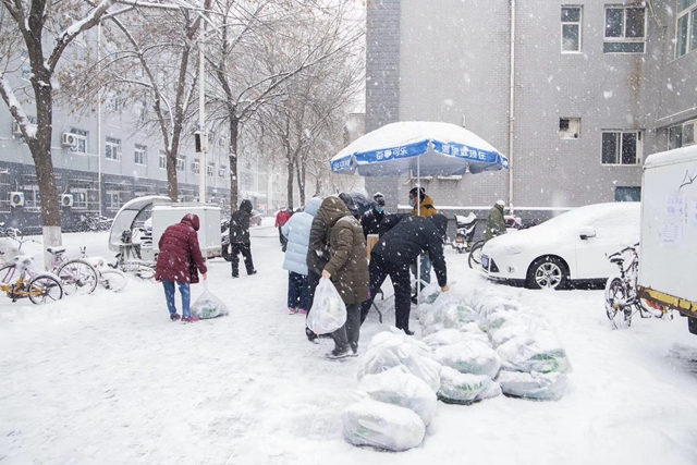2月6日,京城喜迎瑞雪,呈现出最美的冬日校园。在教工食堂外,冒雪而来的教职工不多停留,拿起打包好的新鲜蔬菜有序离开,这一幕是餐饮服务中心组织的蔬菜定量销售。2月6日是试行销售的第一天,大雪中300份打包蔬菜很快销售一空,受到广大居民好评。