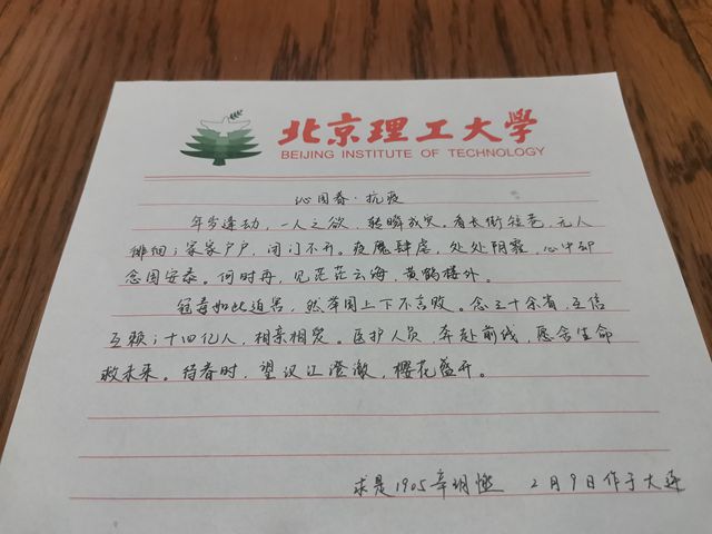 “疫情当下,我留在这片生长的土地上,不害怕,不退缩。与我们千万普通市民共同守护武汉这座城市的,还有全国的支援团队、顶尖医疗技术、四海相助的防疫物资以及举国上下关切的心。”身处武汉的朱芷希同学在微信群里向求是1815团支部成员分享了自己的体会。