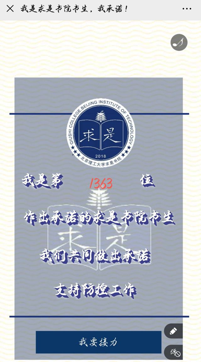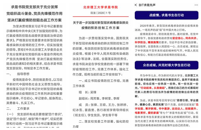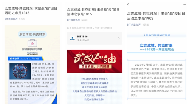 “祖国受难之时,我们更应该理智地保护她,做这个时代冷静的‘发声者’。”“疫情过后,中国青年更具情怀与担当。”“在前进的路上,我们一定还会遇到新的困难,我们也一定有必胜的决心!”自书院七大战“疫”行动实施以来,青年学生反响热烈,优秀网络作品征集投稿踊跃,书院也积极通过官方公众号“BIT求是先声”发布,用正能量鼓励广大求是学子坚定信心,共克时艰。