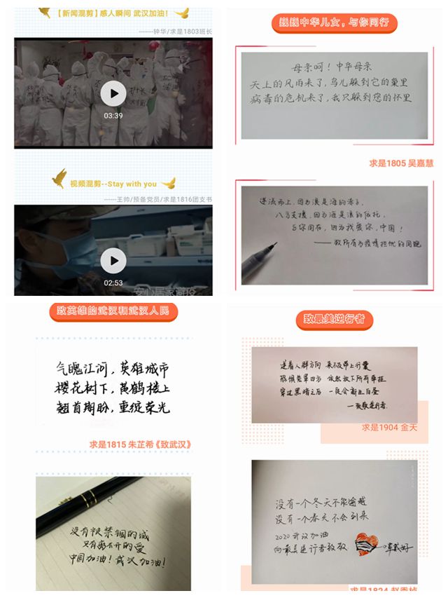 “逆着人群方向,来不及带上行囊。恐惧笼罩四方,依然放下所有牵挂,穿过黑暗之后,一定会新生白昼。”来自求是1904团支部的金天同学用“三行情书”的方式,把敬意和祝福写给奋战在战“疫”一线的人们和武汉人民。在书院的教育引导下,书生们不断增强打赢疫情防控阻击战的信心和决心,积极在网络空间传递正能量。