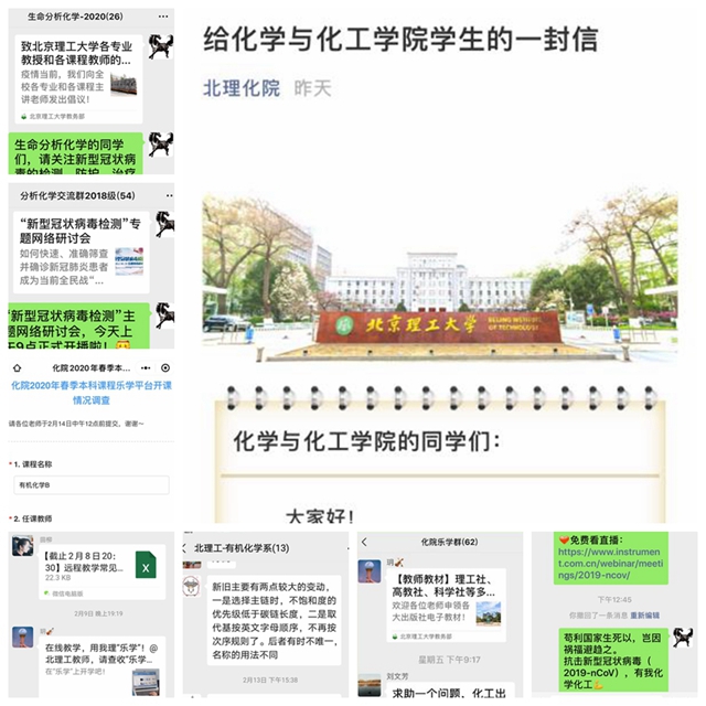 2月4日,学校发布了《关于推迟2020年春季学期开学时间的通知》,学院积极响应,根据学校疫情防控教学专项会议精神,成立以院长书记为组长、教学院长和学生工作副书记为副组长的“化学与化工学院教学质量保障组”,负责落实本学期的教学方案和教学过程的实施情况,确保疫情防控期间本科教学的顺利进行与高质量教学效果。建立了学院乐学微信群,及时讨论、学习乐学平台线上课程的准备以及解决相应的问题,并在群里发布问卷星调查表,随时掌握课程进度和问题;目前,学院除9门需要在实体实验室进行的实践类课程外,全部理论课程(共计29门)已经按照教学计划在乐学平台上建课,主讲教师应用多种信息化资源,录制带音频的PPT、使用MOOC、SPOC等网上优质教学资源,以多种教学模式结合来准备网络授课;同时,在乐学平台基础上,各课程还建立课程微信群、慕课堂等,特别加强与学生互动,督促调动学生学习主动性。《给化学与化工学院学生的一封信》在开课前推送给所有学生,提醒学生主动参与网络教学,齐心协力,完成现阶段远程教与学。