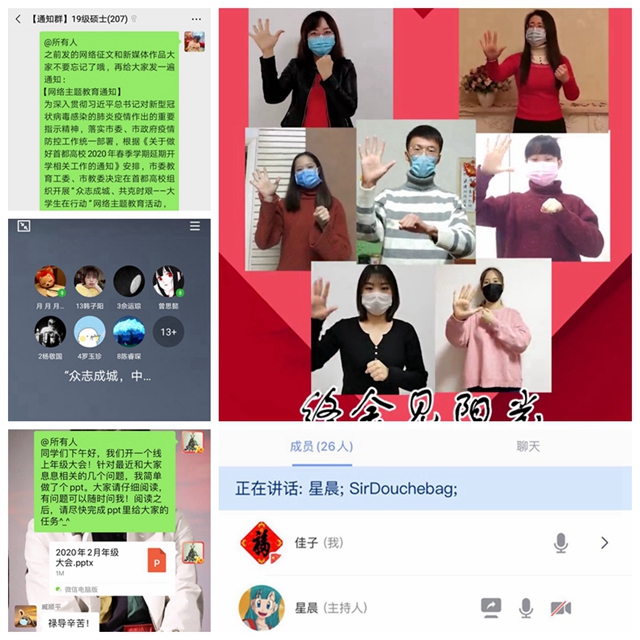 学院迅速占领网络思政教育高地,动员和组织开展“众志成城、共克时艰,大学生在行动”网络主题教育活动,以及“众志成城、中国加油”线上团日活动,创新形式、寓教于乐,通过线上学习、讨论、讲述、实践、展示等方式,鼓励学生抗击疫情的信心决心,引导学生以实际行动弘扬正能量,为打赢疫情防控阻击战做出应有贡献。