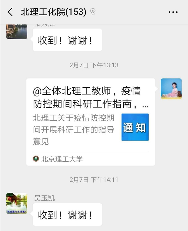 针对疫情防控特殊时期的实际情况,学院迅速转变科研工作模式,充分利用微信群、电子邮箱等形式,做好在线科研管理服务工作。伴随疫情的发生,各级各类应急科研攻关项目通知发布、项目申报方式改变、各项工作面临时间调整等,当前又正值国家自然科学基金集中申报期,各种通知纷至沓来,做好科研管理与服务尤为关键。学院通过线上途径,确保了各类通知及时有效的传达,对教师提出的个性化问题做出及时的回应处理,畅通了特殊时期科研管理沟通渠道,保障了科研工作的平稳运行。