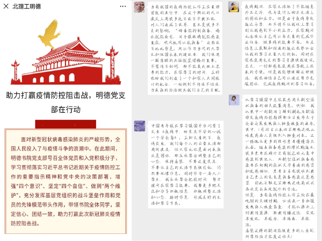 “作为学生党员,我们要时刻牢记使命,树立起服务同学、联系同学、号召同学的意识。”明德书院学生党员,积极响应,以网络社交平台为阵地,充分发挥先锋模范带头作用,助力打赢此次新冠肺炎疫情防控阻击战。