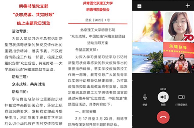 当前新型冠状病毒肺炎疫情的防控工作正处于关键时期,明德书院党支部带领入党积极分子,以“一帮一结对子”“互助小组”等形式密切联系同学、组织同学、凝聚同学,帮助同学们正常有序地开展居家学习生活。党支部带领同学们利用“学习强国”平台,开展理论学习活动;鼓励大家运用好在家时间提前学习,为下个学期做准备;组织学习小组,协助、督促同学落实学校利用线上课堂进行远程教学的相关安排,切实做到停课不停学。在党支部的带领下,书院同学相互关心、相互帮助,以积极的态度和良好的身心状态面对疫情与生活,科学安排自己的时间,安心在家配合防疫,为战胜疫情贡献青春力量。