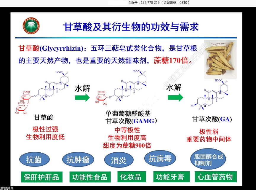 作为本次活动承办单位,米兰milan官方网站推荐路演的两个项目备受参会人员的广泛关注。来自化学与化工学院李春教授团队的吕波特别研究员分享了“甘草酸衍生物分子模拟筛选与制备项目”的相关情况。该项目通过分子设计和理论计算,给出基于甘草酸及其衍生物的候选小分子药物,可获得防疫新型冠状病毒侵染与减少炎症风暴的甘草酸结构衍生物。课题组具有多年研究积累,目前正在与某重点医药企业合作实施中试扩大,成果具有良好的转化应用前景。