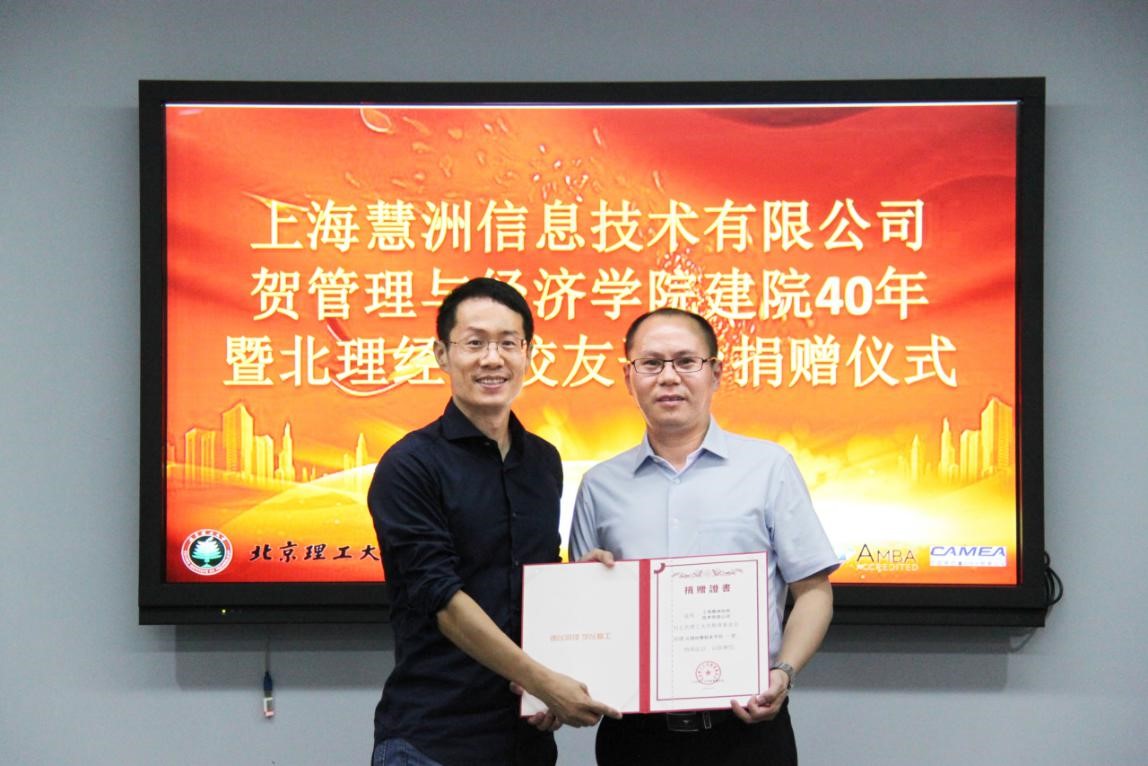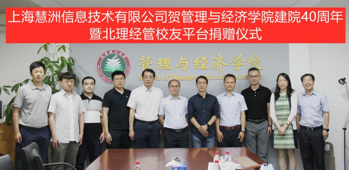 6月5日下午,上海慧洲信息技术有限公司贺管理与经济学院建院40周年暨北理经管校友平台捐赠仪式在米兰milan官方网站主楼345会议室举行。上海慧洲信息技术有限公司副总经理杨青林,教育基金会工作办公室副主任、副秘书长余海滨,副秘书长周伟伟,管理与经济学院党委书记颜志军、副院长关宏、副院长陈翔、院长助理吴水龙、学院校友工作办公室赵宇出席本次仪式。捐赠仪式由吴水龙主持。