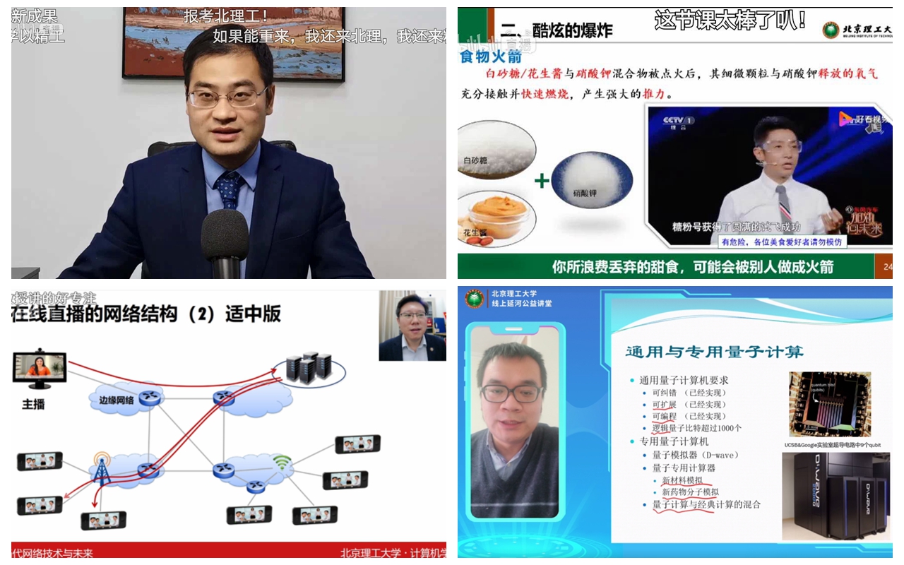 管理与经济学院韩伯棠教授以“田忌赛马”为引,详细解读了工商管理中的科学问题,虽年过七旬但声如洪钟,慷慨激昂地感染着每一位观众;机电学院罗庆生教授结合团队实战经验和典型案例,讲述了高校双创人才培养的“天龙八步”法则,生动形象的演绎讲授,不仅为双创学子释疑解惑,还让双创导师收获满满;自动化学院孙健教授围绕自动控制技术,带领师生公众从亚历山大时期穿越至21世纪,共同探讨自动控制的起源与发展,丰富的诗词引用让网络课堂喝彩连连;材料学院马壮教授结合被称为“最快的刀”“最准的尺”“最亮的光”的激光技术,为大家介绍高能激光会对材料和装备造成什么样的损伤,共同探讨保证装备安全的特种防护材料技术,视频动画等案例的完美结合让课程质量倍增……